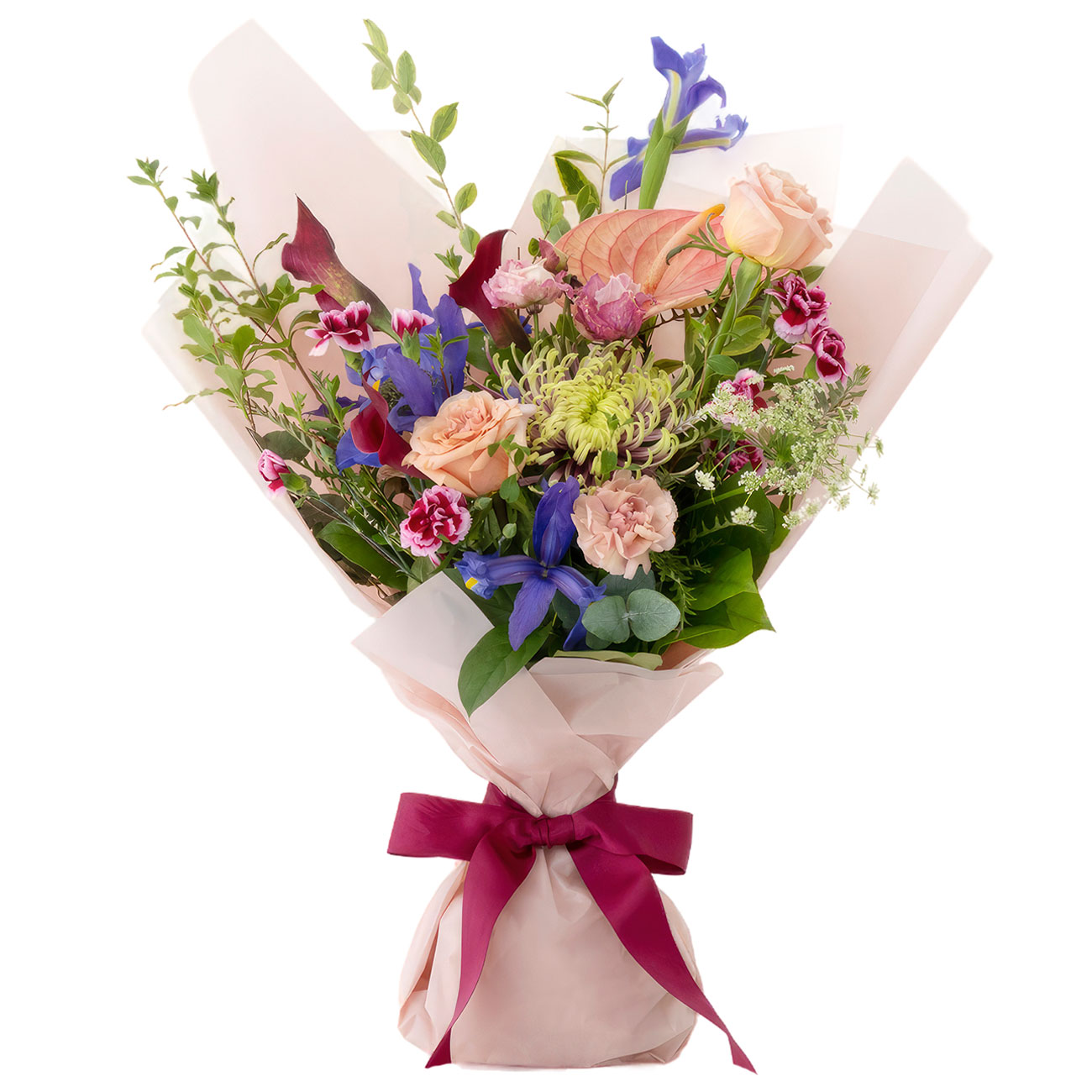 Роза цвета шампанского, хризантема окрашенная голландская, антуриум розовый, гвоздика кустовая розово-бордовая, ирис фиолетовый голландский, калла бордовая голландская. Упаковка (лента, пленка, крафт, сетка, пленка матовая)