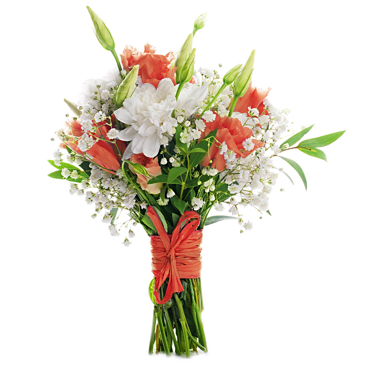 Эустома лизиантус оранжевая, хризантема одноголовая белая, гипсофила, зелень. Упаковка (лента, пленка, крафт, сетка, пленка матовая)