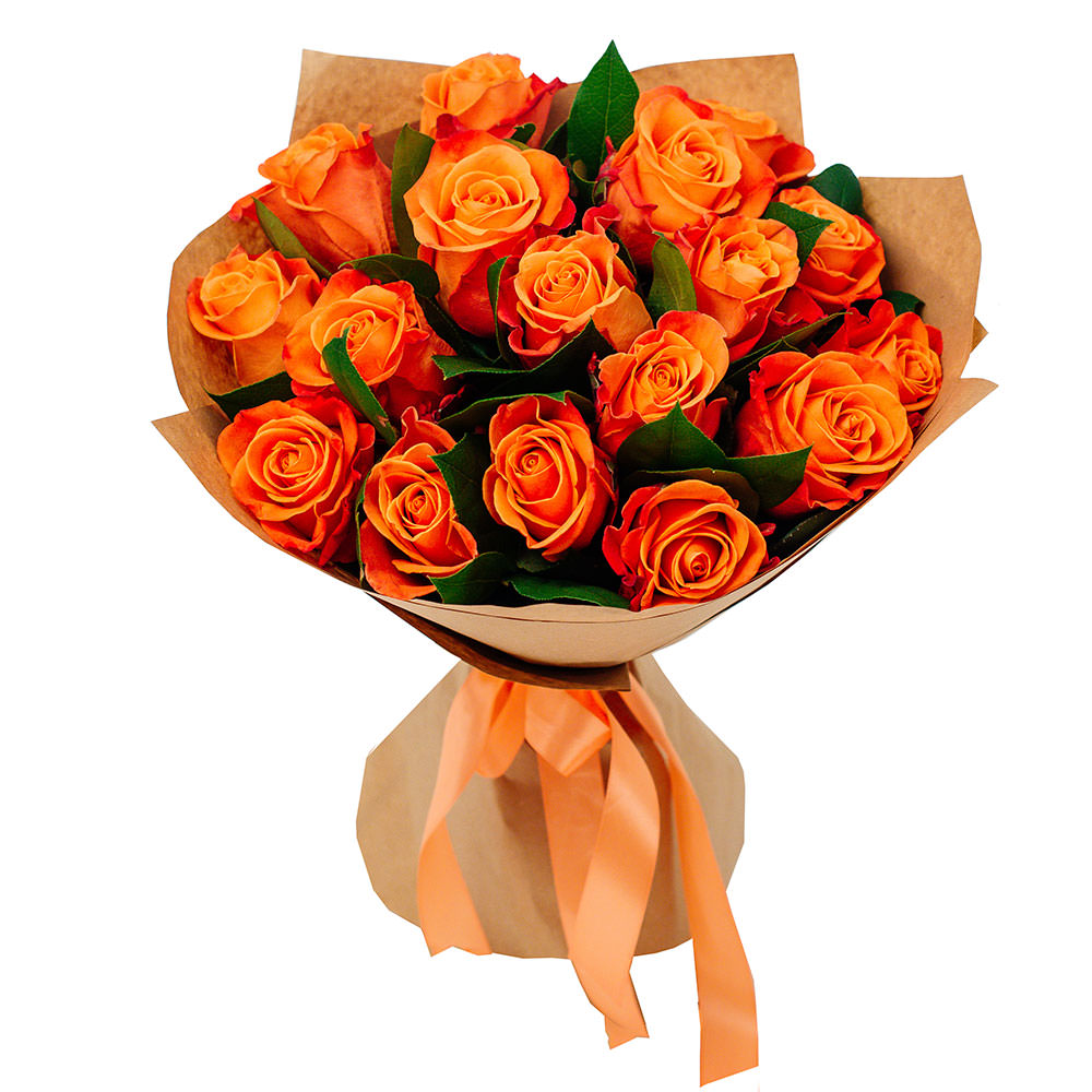 Роза одноголовая оранжевая, зелень. Упаковка (лента, пленка, крафт, сетка, пленка матовая)