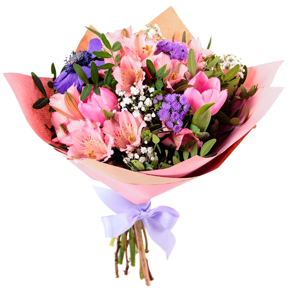 Агератум, тюльпан розовый, альстромерия розовая, фисташка, анемон синий, гипсофила. Упаковка (лента, пленка, крафт, сетка, пленка матовая)