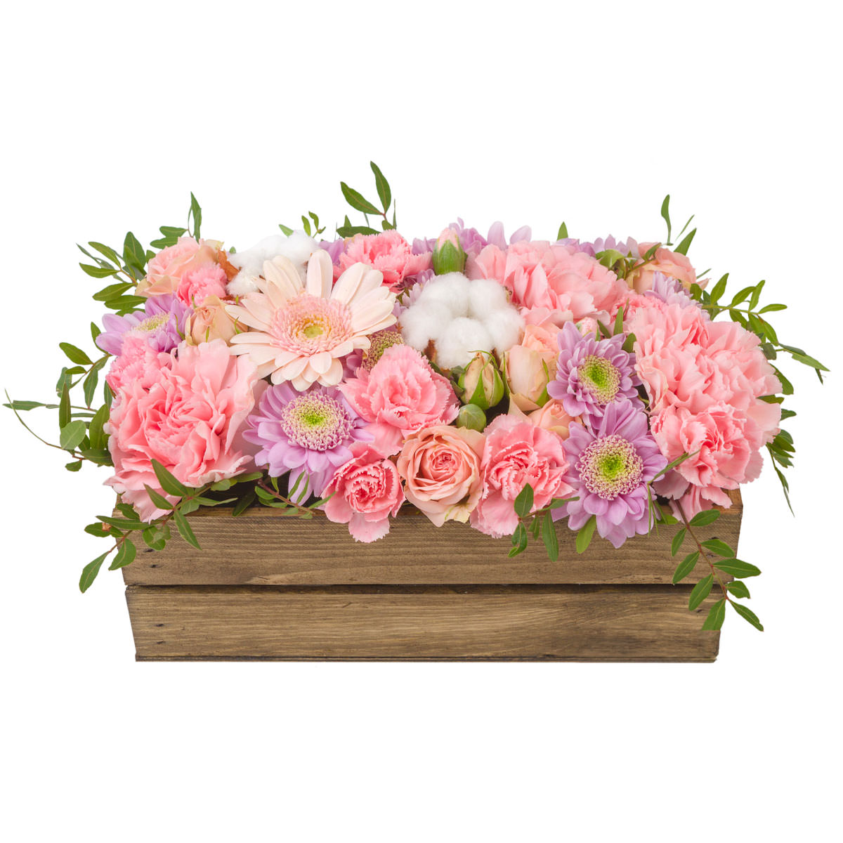 | Состав | Гвоздики, Герберы, Кустовые розы, Розы, Хлопок |