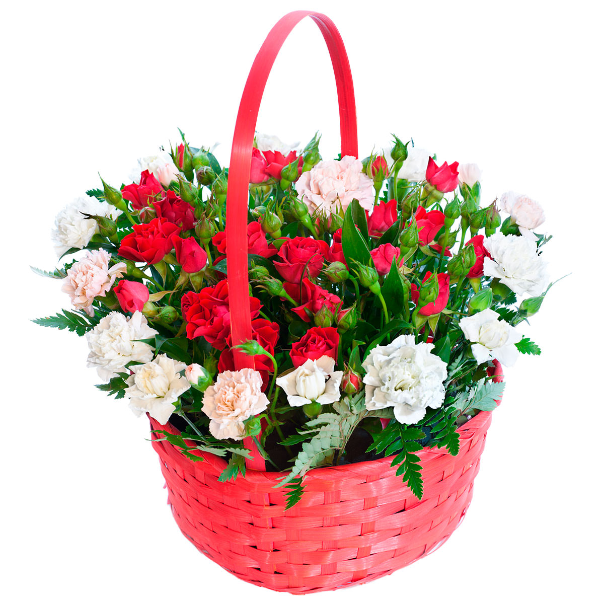 Роза кустовая красная, гвоздика мини белая. Упаковка (Корзина, оазис, ящик).
