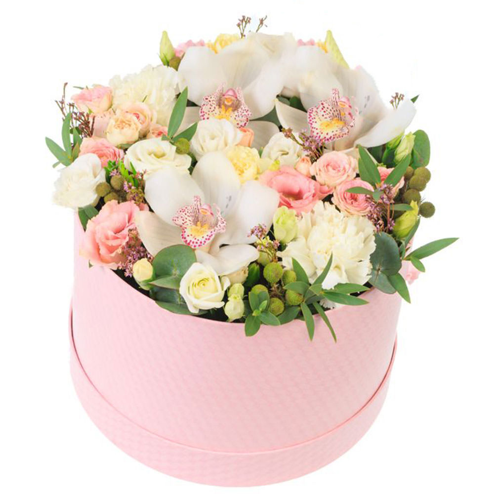 Орхидея белая, роза кустовая розовая, эустома белая и розовая, бруния, фисташка. Упаковка (шляпная коробка, квадратный бокс, коробка сердце, оазис)