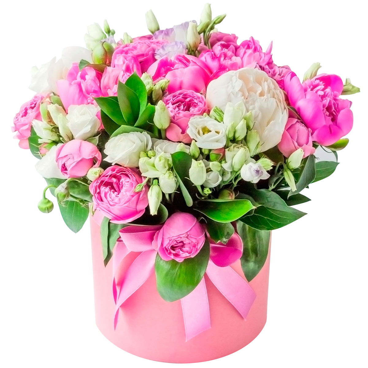 Пион белый и розовый, роза кустовая пионовидная розовая, эустома белая. Упаковка (шляпная коробка, квадратный бокс, коробка сердце, оазис)