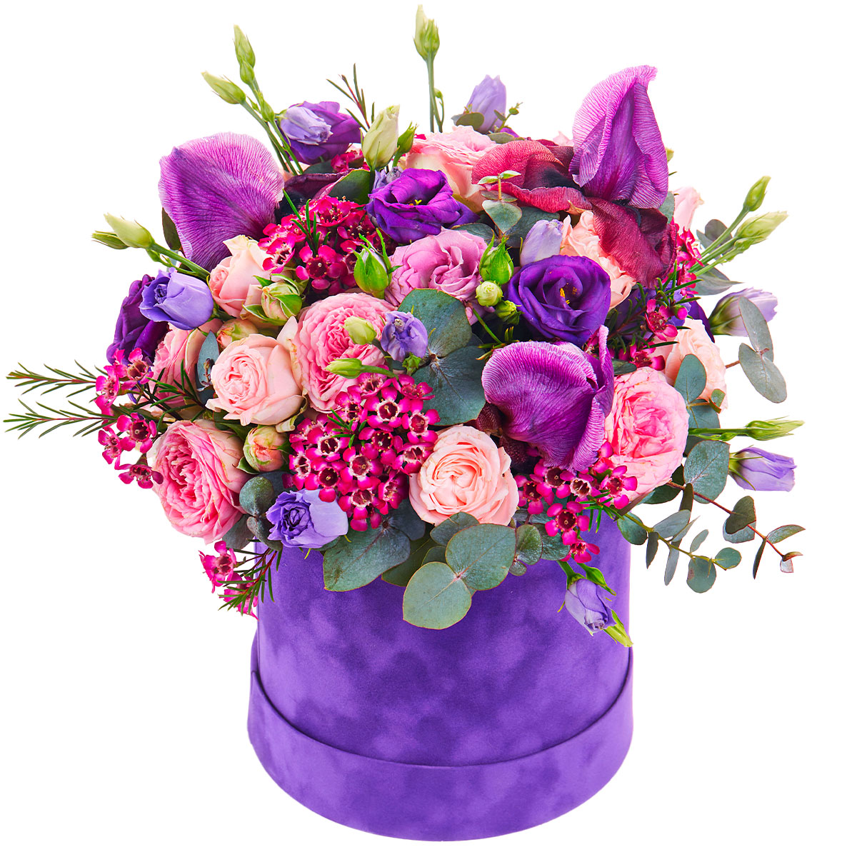 Роза пионовидная розовая, эустома фиолетовая, ирис фиолетовый, ваксфлауэр сиреневый, эвкалипт. Упаковка (шляпная коробка, квадратный бокс, коробка сердце, оазис)