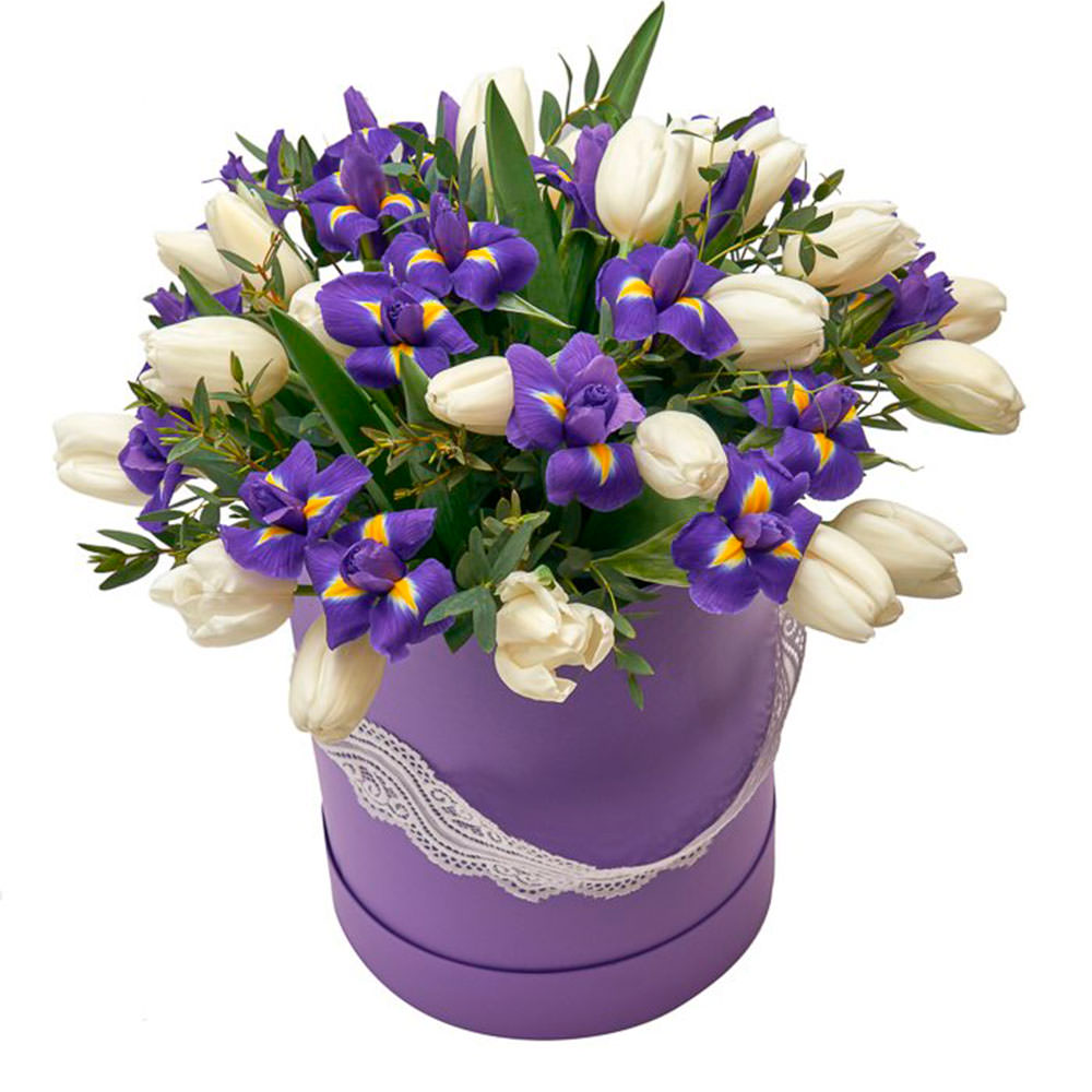 Ирис, тюльпан белый, аспарагус. Упаковка (шляпная коробка, квадратный бокс, коробка сердце, оазис)