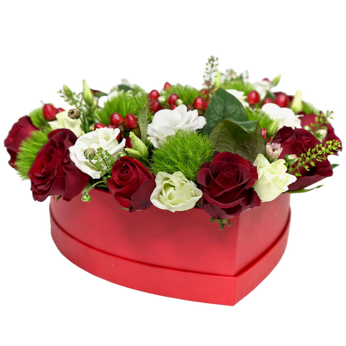 Роза одноголовая красная, роза кустовая белая, гиперикум, тласпи. Упаковка (шляпная коробка, квадратный бокс, коробка сердце, оазис)