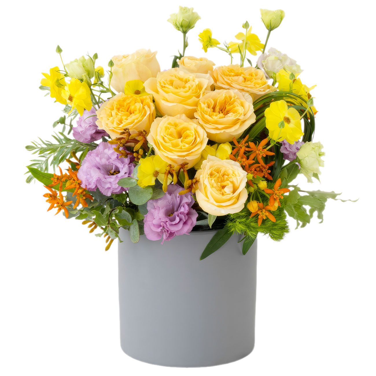 Роза кения желтая, лютик желтый, голландская асклепиас (бабочковый куст). Упаковка (шляпная коробка, квадратный бокс, коробка сердце, оазис)