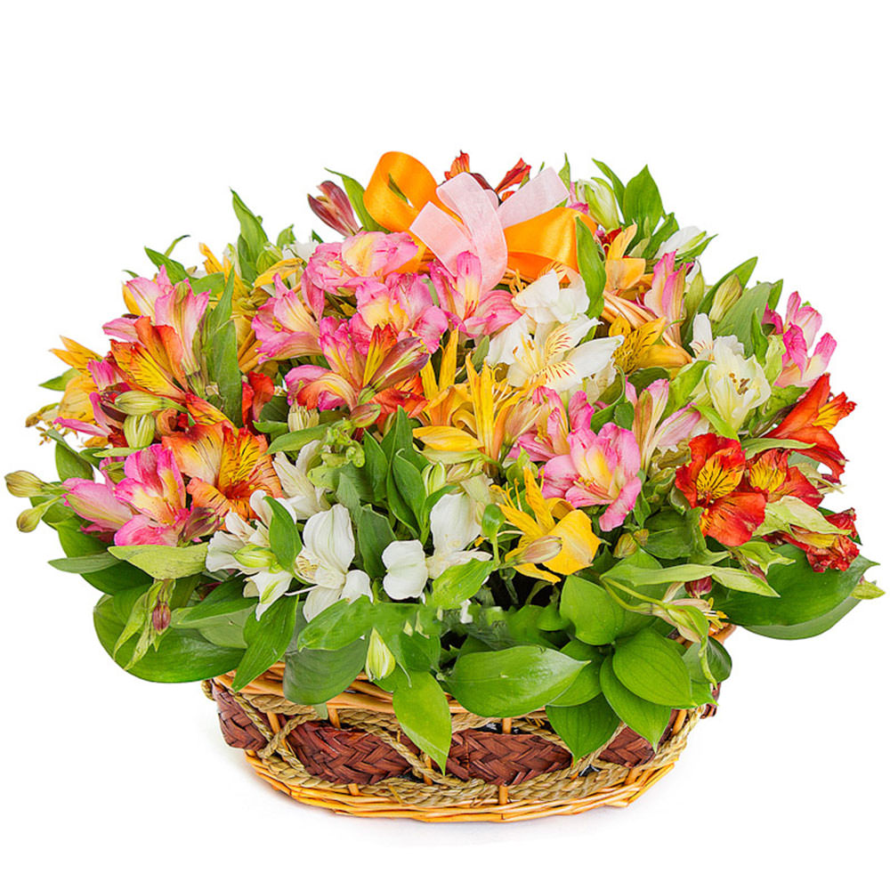 Альстромерия микс (розовая, оранжевая, красная, желтая, белая), зелень. Упаковка (Корзина, оазис).